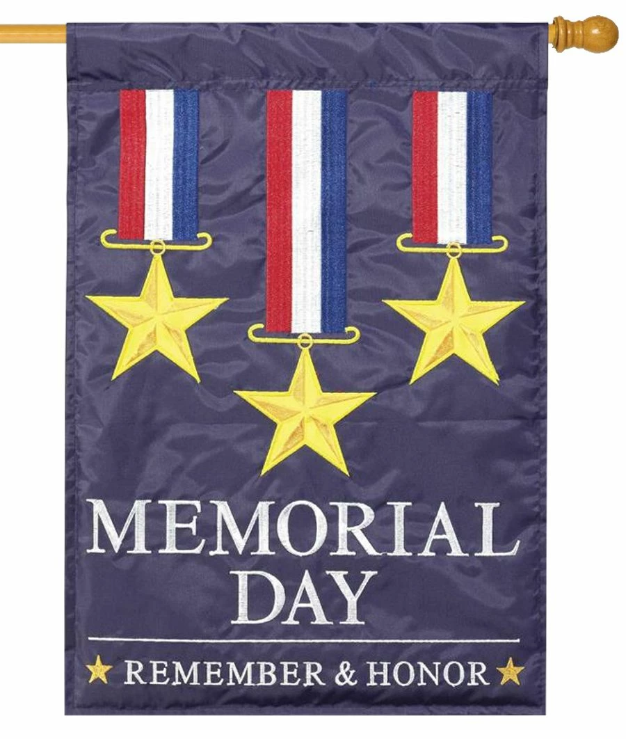 “Memorial Day” is a time of remembrance and this beautifully stitched house flag is a wonderful opportunity to display your love for someone lost. Whether you have known someone personally or you’d just like to display a remembrance for all, this flag is perfect. Use this at your home, business, or even in a Memorial Day parade. The lettering reads correctly on both sides.