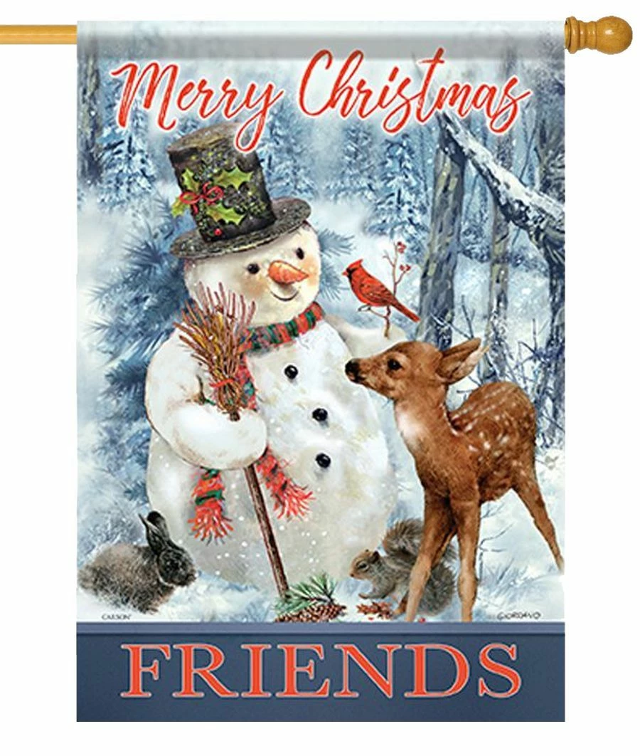 Wintertime friends meet each other on this decorative house flag. The image shows a kindly snowman with a black top hat and red plaid scarf. The snowman is holding a straw broom. Beside the snowman is a fawn with a red male cardinal nearby. The trio is in the snowy woods. The message reads across the top, “Merry Christmas” in red script. The message continues on the bottom blue border, “FRIENDS” in red lettering. The lettering reads correctly from both sides. This decorative house flag is a beautiful way to welcome visitors to your home during the Christmas season.