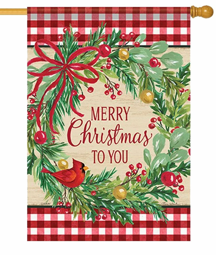 Wish everyone a happy holiday season with this decorative house flag. The image shows a large green decorated Christmas wreath with a male cardinal perching on its side. A large red bow decorates the top of the wreath. The message reads in the center of the wreath, “Merry Christmas to You” in red lettering on a pale tan background. Red and white checked borders run across the top and bottom. The message reads correctly from both sides. This decorative house flag is a lovely, traditional Christmas decoration.