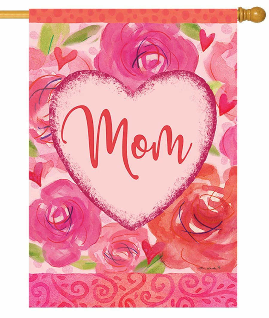 Show your mom some love this Mother’s Day with this decorative house flag. The artwork shows a big pink heart. Inside the heart, the message reads, “Mom” in dark pink script. The heart is surrounded by roses in various shades of pink and red. A border of pink and fuchsia curlicues runs across the bottom. The message reads correctly from both sides. This decorative house flag lets the most important woman in your life know how you feel! Artwork by Tina Wenke.