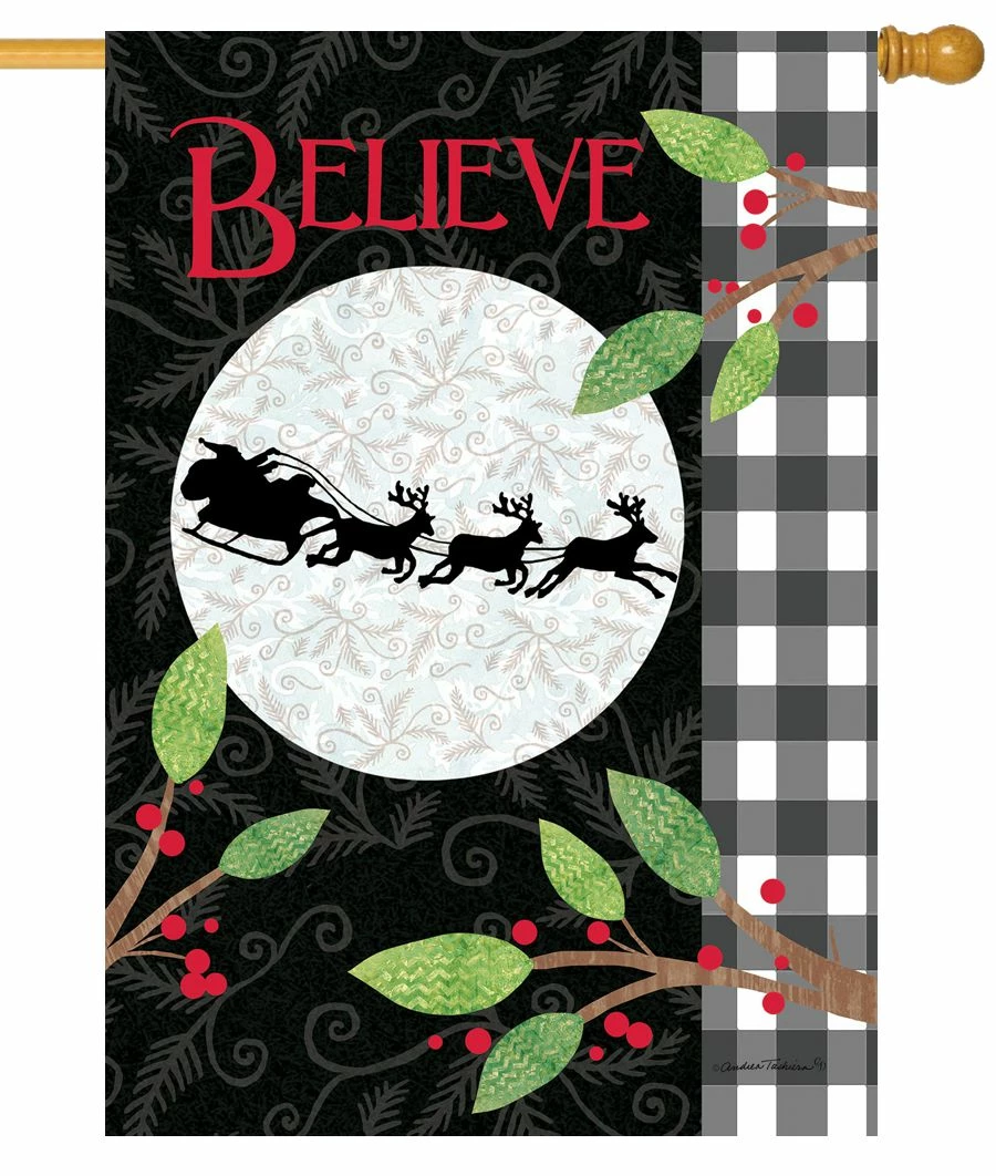 He knows when you are sleeping as seen on this decorative house flag. The artwork shows a large moon with a silhouette of Santa, his sleigh, and reindeer speeding through the sky. Stylized greenery with red berries compliments the image. The background is black with an ornate watermarked pattern. The message reads across the top, “Believe” in red lettering. The lettering reads correctly from both sides. This decorative house flag evokes tender memories of Christmastime. Artwork by Andrea Tachiera.