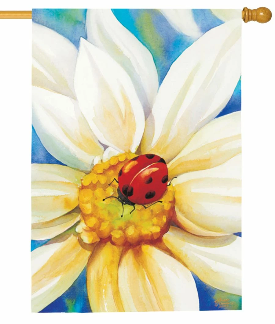 Morning Daisies textured suede house flag will make a lovely decorative addition to your home or office. This house flag features a blue sky and a close-up of the daisy with a ladybug. Viewable on both sides.