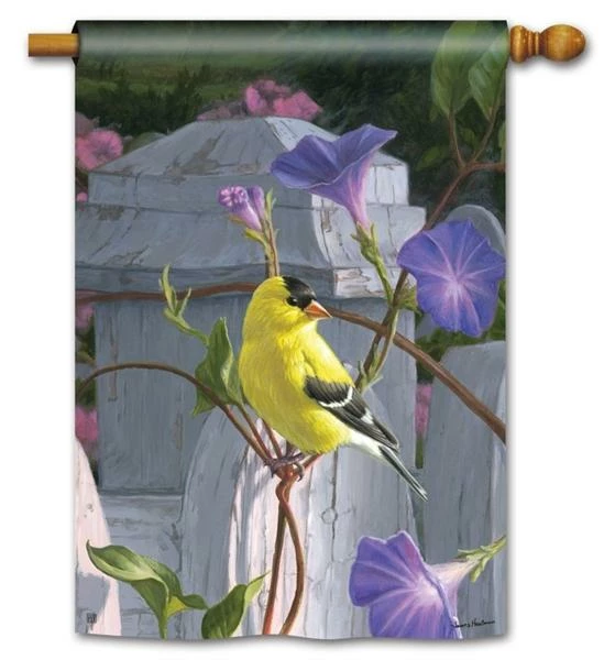 The bright yellow finch shown here on this decorative house flag is quite stunning with the contrasting purple morning glory blooms seen climbing up the old white fence. Perfect for just about any spring or summertime outdoor or indoor setting.