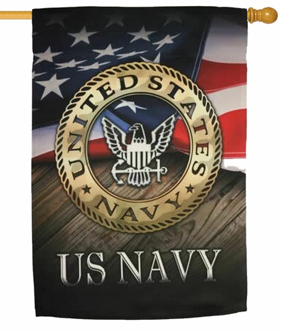 This United States Navy, house flag depicts a waving American flag in the background with an incredibly detailed, gold-plated, circular Navy emblem with a silver eagle as the centerpiece. The dark outer edge and distressed wood that creates the lower part of the background lend this design a rich, yet rustic appeal. What a cool-looking flag to decorate the outside of even the inside of your Home, business, or man cave. The “United States Navy” around the gold emblem, as well as the “US Navy” lettering towards the bottom, both read correctly from both sides of the flag.