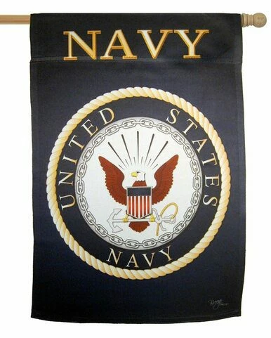 This United States Navy house flag features a round Naval Eagle logo centered on a dark blue background. The lettering is shaded to appear as if it is three-dimensional, gold metal and reads correctly from both sides of the flag.