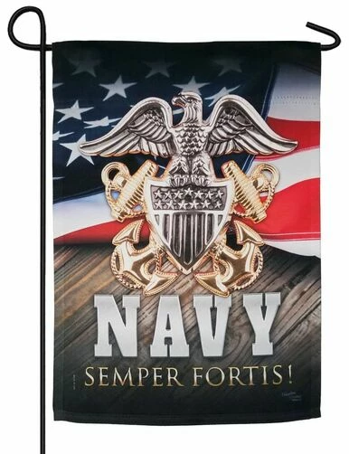 This United States Navy, Semper Fortis, garden flag depicts a waving American flag in the background with an incredibly detailed, chrome and gold plated, eagle shield and double anchor insignia as the centerpiece. The dark outer edge and distressed wood that creates the lower part of the background lend this design a rich, yet rustic appeal. What a cool-looking flag to decorate the outside of even the inside of your Home, business, or man cave. The “Navy Semper Fortis!” lettering reads correctly from both sides of the flag.