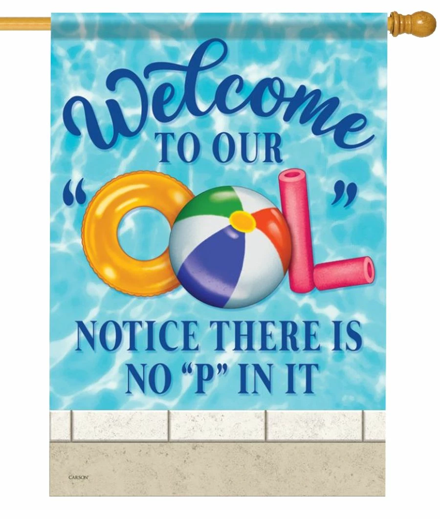 “Welcome to Our OOL” “Notice there is no P in it”. Perfect house flag to display outside of your pool this summer to make sure everyone knows your pool is clean. The wording reads correctly on both sides of the flag.