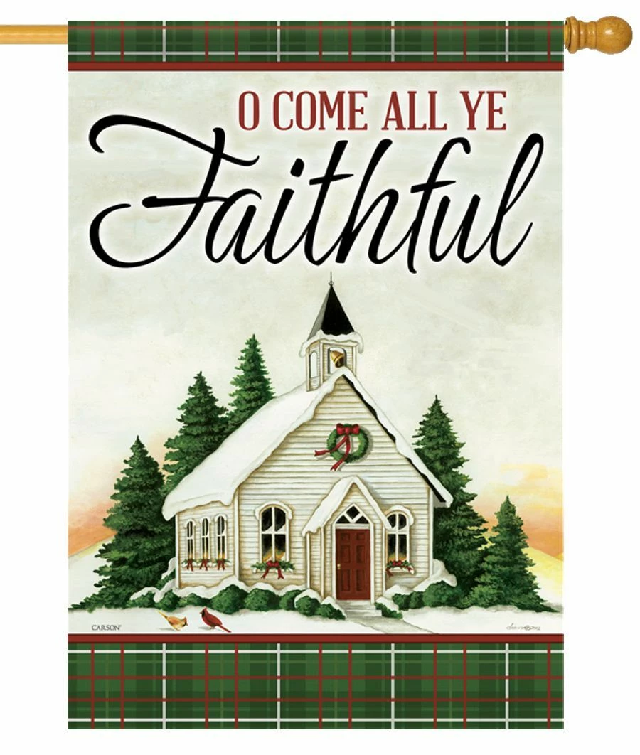 Welcome guests with the classic Christmas carol on this double-sided decorative house flag. The scene on the flag is a white country church decorated for Christmas. The church is surrounded by green trees and snow. The message above the church reads, “O Come all ye Faithful” in red and black lettering. Green and maroon plaid borders run across the top and bottom of the flag. This is a double-sided decorative house flag so the message and image read correctly from both sides. What a charming decorative house flag to decorate with this holiday season.