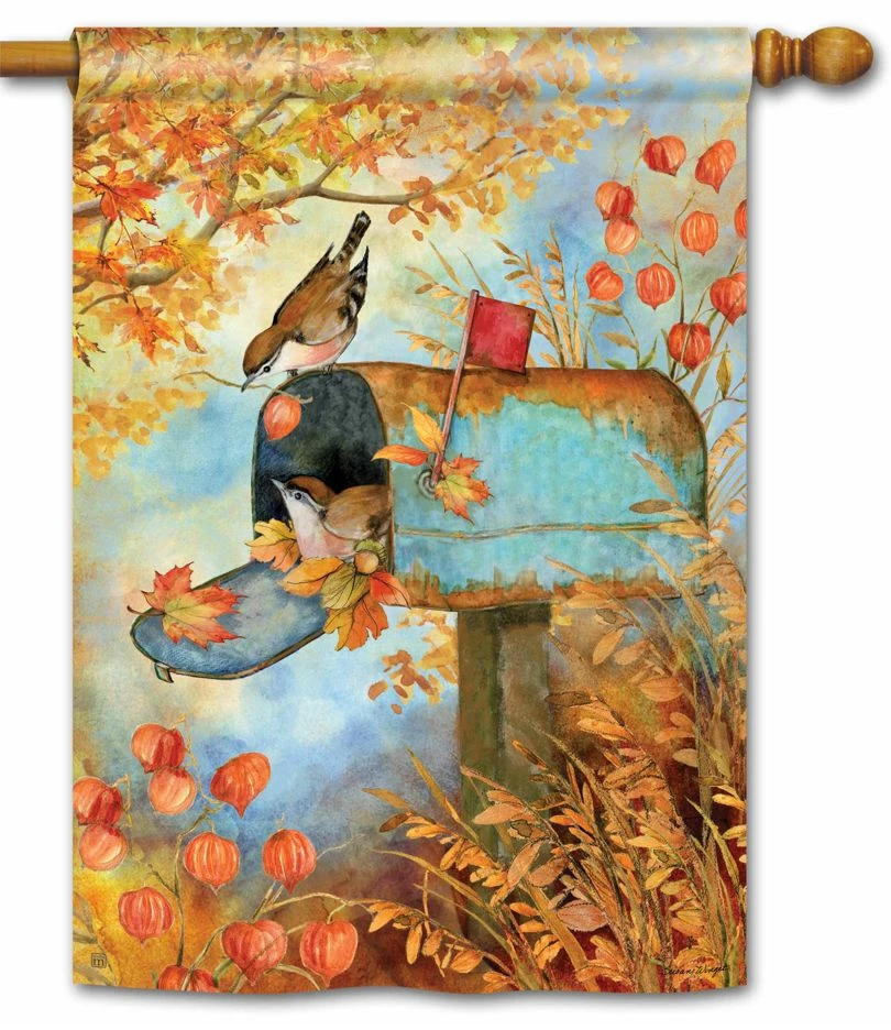 Enjoy displaying this beautiful fall scene on your house flag of two birds who have established their nest inside an old rusty mailbox. This is perfect for fall as it has all the colors and would look great at your home, office, or fall festival. The artwork is on both sides of the flag.