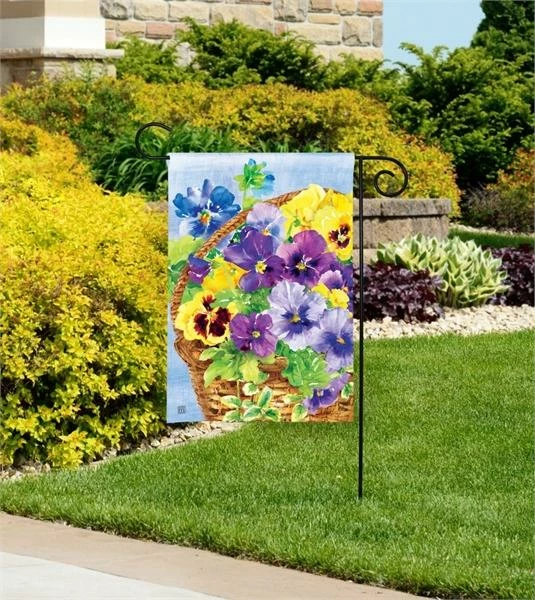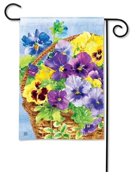 Enjoy the springtime blooming season and make it even that much more fun with this gorgeous garden flag depicting a colorful bouquet of pansies in a wicker basket against a light blue background. What a great way to add a splash of springy color to the seasonal decor of your Home or business.