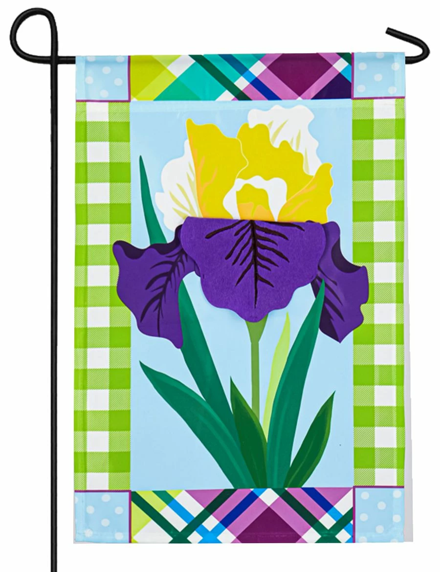 Here is a garden flag with a close-up view of a gorgeous purple iris with an eclectic collection of plaid and polka dot patterns that make up the outer border. The springy bright colors all work together perfectly to bring an artistic and lovely design to your springtime seasonal decor. The flower features 3D construction that appears on both sides of the flag along with all of the other artwork. Celebrate the freshness of spring with this lovely garden flag for your Home or business.