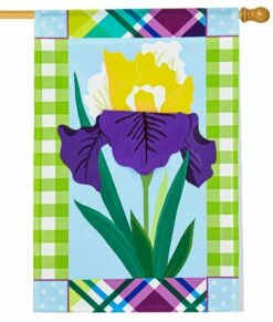 Here is a close-up view of a gorgeous purple iris with an eclectic collection of plaid and polka dot patterns that make up the outer border. The springy bright colors all work together perfectly to bring an artistic and lovely design for your springtime seasonal decor. The flower features 3D construction that appears on both sides of the flag along with all of the other artwork. Celebrate the freshness of spring with this lovely house flag for your Home or business.