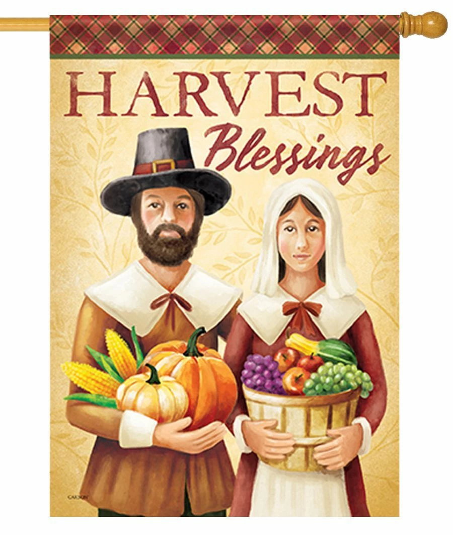 Welcome family and friends this Thanksgiving season with a traditional image on this double-sided decorative house flag. The image on the flag are a pilgrim couple holding the bounty of the season. The woman holds a basket of fruit and vegetables. The man holds two pumpkins and corn. They are shown against a beige background. The message reads across the top, “Harvest Blessings” in dark brown lettering. A brown and beige plaid border runs across the top. As a double-sided decorative house flag, the message and image read correctly from both sides. This decorative house flag reminds us of the reason for the Thanksgiving holiday.
