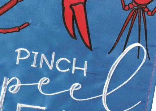 This crawfish themed double applique house flag features rich looking, heavy embroidery and applique work as well as boldly embroidered “Pinch Peel Eat Repeat” lettering that reads correctly from both sides of the flag. Made for outdoor use, but attractive enough to display indoors as well.