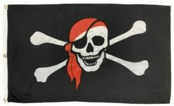 Dress up your pirate ship in style with this super cool Jolly Roger flag depicting a skull and cross-bones sporting a bright red bandana. Made of 2-ply polyester, which is the most durable and best option for those who fly their flag 24/7. This flag features beautifully sewn embroidery and applique work that is visible on both sides of the flag.