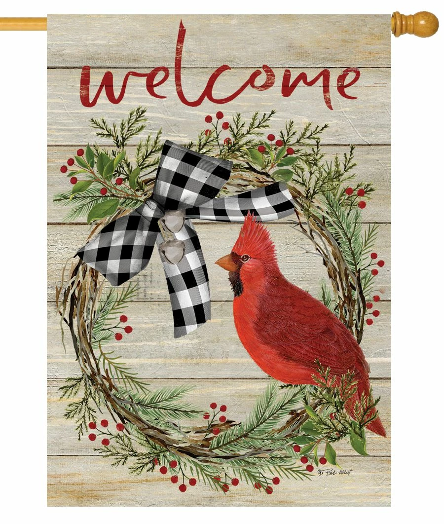 Greet your guests with this stylish decorative house flag. The artwork shows a red cardinal perching on a greenery wreath with red berries. The wreath is decorated with a black and white checked bow. The background is wooden. The message reads across the top, “Welcome” in red lettering. The lettering reads correctly from both sides. This decorative house flag is the perfect traditional decoration. Artwork by Beth Albert.