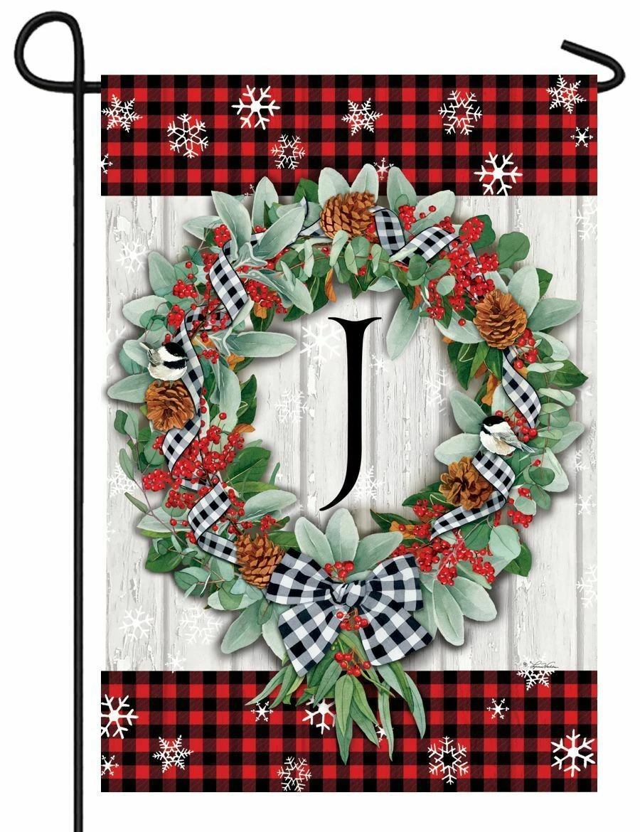 Decorate your Home this Holiday season with a monogram garden flag featuring a heavily embroidered, black monogram letter “J” in the center of a beautifully decorated eucalyptus wreath. A fashionable-looking black and white gingham plaid ribbon is woven through the contours of the wreath. The wreath is also festooned with bright red holly berries and pinecones that provide the perfect accent for the gingham ribbon that is tied up in neat a bow at the bottom. The distressed whitewashed wood background is enhanced by the red and black buffalo plaid borders across the top and bottom. Delicate-looking, ornate snowflakes appear against the backdrop thus adding an extra bit of Christmastime cheer to the design. The monogram letter “J” is embroidered onto both sides of the flag and reads correctly from both sides. Personalize and dress up your Holiday seasonal décor this year with this rich-looking, fashionable design. This flag will fit on any garden flagpole. Flag size 12” x 18”. Artwork by Lynnea Washburn.