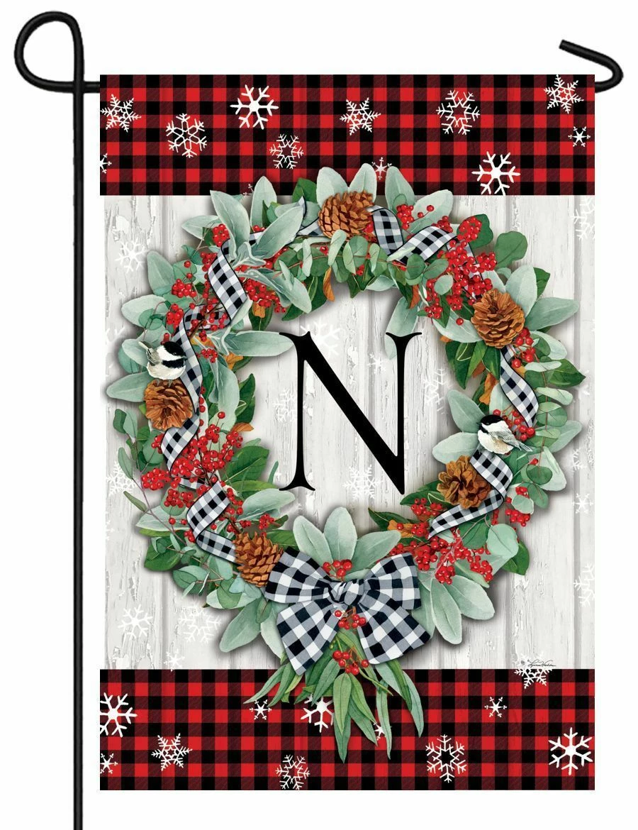Decorate your Home this Holiday season with a monogram garden flag featuring a heavily embroidered, black monogram letter “N” in the center of a beautifully decorated eucalyptus wreath. A fashionable-looking black and white gingham plaid ribbon is woven through the contours of the wreath. The wreath is also festooned with bright red holly berries and pinecones that provide the perfect accent for the gingham ribbon that is tied up in neat a bow at the bottom. The distressed whitewashed wood background is enhanced by the red and black buffalo plaid borders across the top and bottom. Delicate-looking, ornate snowflakes appear against the backdrop thus adding an extra bit of Christmastime cheer to the design. The monogram letter “N” is embroidered onto both sides of the flag and reads correctly from both sides. Personalize and dress up your Holiday seasonal décor this year with this rich-looking, fashionable design. This flag will fit on any garden flagpole. Flag size 12” x 18”. Artwork by Lynnea Washburn.