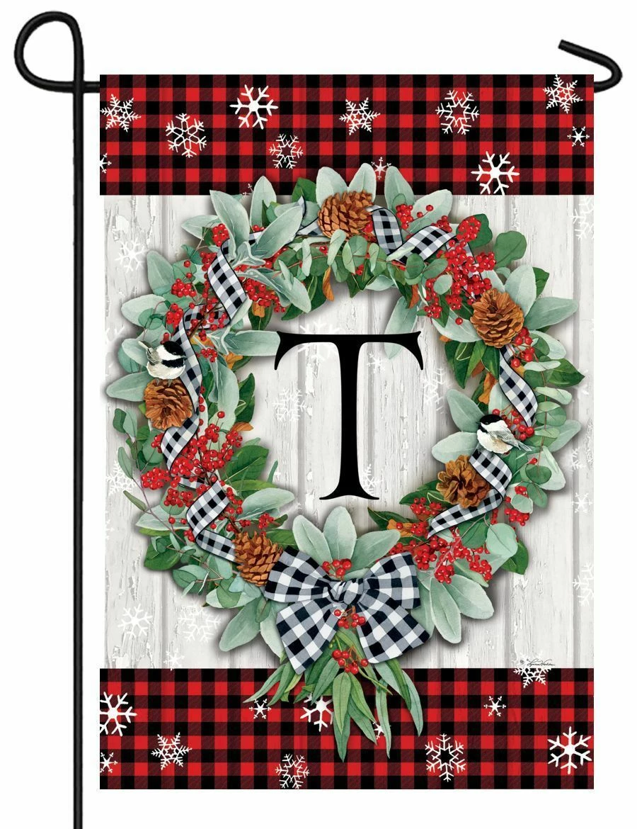 Decorate your Home this Holiday season with a monogram garden flag featuring a heavily embroidered, black monogram letter “T” in the center of a beautifully decorated eucalyptus wreath. A fashionable-looking black and white gingham plaid ribbon is woven through the contours of the wreath. The wreath is also festooned with bright red holly berries and pinecones that provide the perfect accent for the gingham ribbon that is tied up in neat a bow at the bottom. The distressed whitewashed wood background is enhanced by the red and black buffalo plaid borders across the top and bottom. Delicate-looking, ornate snowflakes appear against the backdrop thus adding an extra bit of Christmastime cheer to the design. The monogram letter “T” is embroidered onto both sides of the flag and reads correctly from both sides. Personalize and dress up your Holiday seasonal décor this year with this rich-looking, fashionable design. This flag will fit on any garden flagpole. Flag size 12” x 18”. Artwork by Lynnea Washburn.