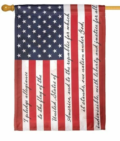 This is an American-style house flag with the words of the pledge of allegiance in a vintage script lettering that reads correctly from both sides of the flag. The background has an antiqued, parchment finish that offers an old-world appearance. Hang this flag up at your Home or business to celebrate American heritage and honor the pledge of allegiance.