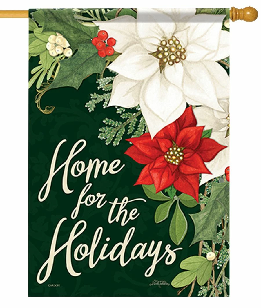 “Home for the Holidays” is an excellent house flag to display for the season. Rich in color with its elegant dark green background is red and white poinsettias with foliage and berries. You can’t go wrong with this one! The wording is correct on both sides of the flag.