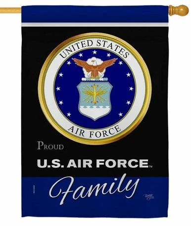 This “United States Air Force, Proud US Air Force Family” house flag features a gold-trimmed Air Force eagle seal centered on a black background with blue top and bottom borders. The lettering reads correctly from both sides. Show your military family pride and display this beautiful, rich-looking flag at your Home.