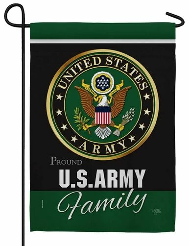This βUnited States Army, Proud US Army Familyβ, garden flag features a gold-trimmed Army eagle seal centered on a black background with green top and bottom borders. The lettering reads correctly from both sides. Show your military family pride and display this beautiful, rich-looking flag at your Home.