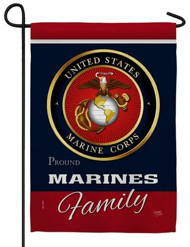 This “United States Marine Corps, Proud Marines Family”, garden flag features a gold-trimmed eagle, globe, and anchor seal centered on a black background with bright red top and bottom borders. The lettering reads correctly from both sides. Show your military family pride and display this beautiful, rich-looking flag at your Home.