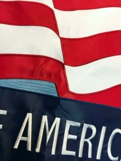 Patriotic, “Proud to be American”, double applique house flag with meticulously detailed embroidery and applique work depicting a waving American flag against a light blue background. The heavily embroidered, bold “Proud to be American” lettering reads correctly from both sides of the flag. Hang this Americana themed design up at your Home or business for patriotic holidays or every day.