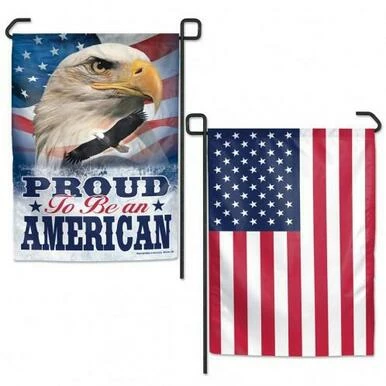 Patriotic Eagle themed decorative garden flag, featuring two different images on either side of the flag. A regular American flag on one side and a majestic looking eagle with “Proud to be an American” inscribed below on the other side. Hang this cool looking design up on patriotic holidays or everyday to show your American pride.
