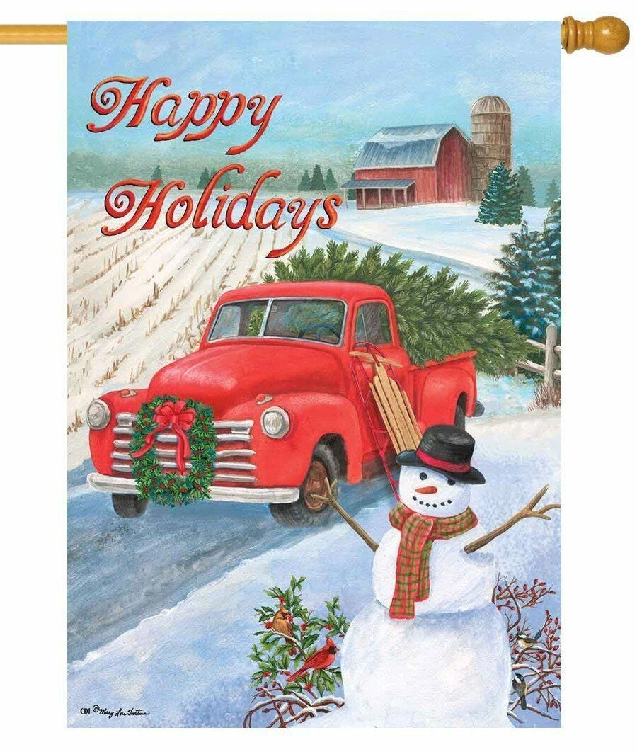 Country Christmas themed house flag with an antique red truck hauling a freshly cut Christmas tree home to decorate for the season. The snow covered, plowed field, big red barn and friendly snowman standing by the road, will make you feel like you are home at the farm for Christmas. The bright red “Happy Holidays” lettering reads correctly from both sides. This flag is made for outdoors but is attractive enough to hang up indoors as well.