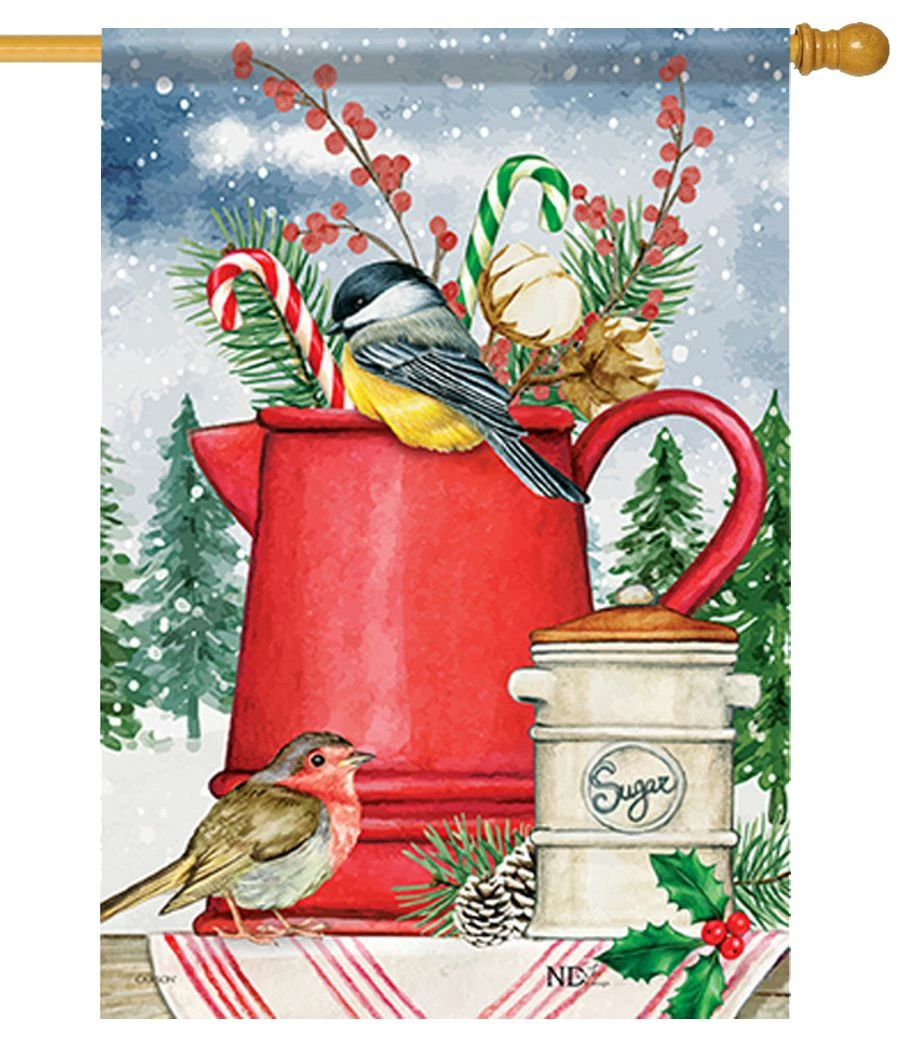 Enjoy this beautiful Winter scene of a goldfinch and a robin sitting near a red watering can full of pine, berries, cotton, and candy canes, alongside it a canister of sugar. This house flag can easily be displayed at your home or business.