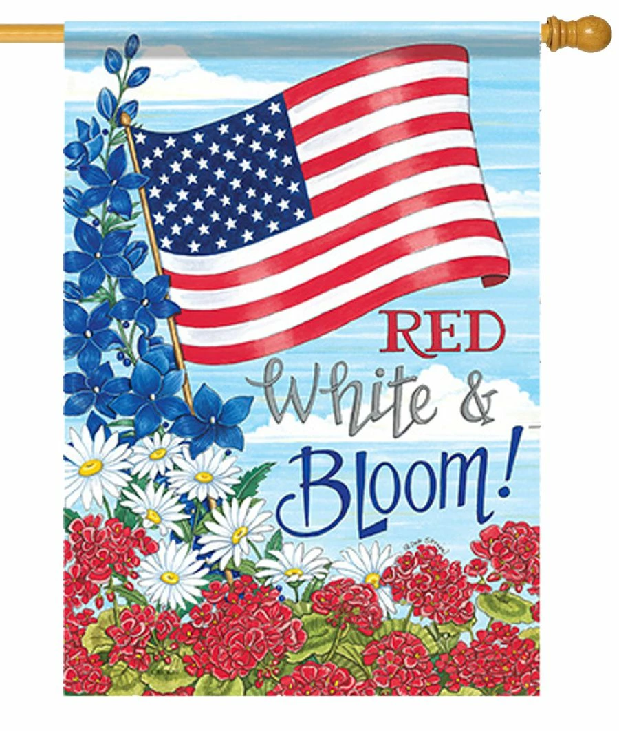 “Red, White, and Bloom!” is a beautiful flag featuring Old Glory flying high in the sky surrounded by numerous patriotic colored flowers. This would look great at your home, office, or the Fourth of July. Readable on both sides.