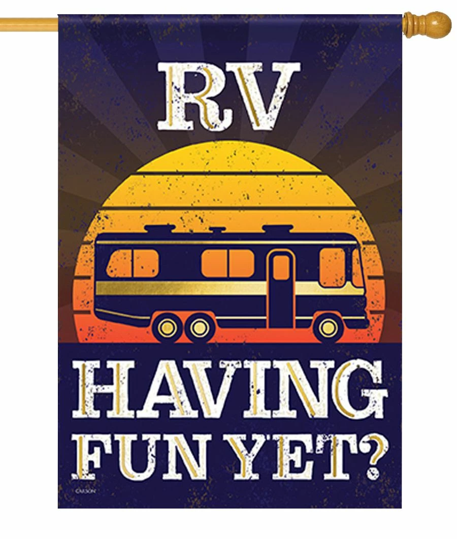 Ride off into the sunset in your recreational vehicle, and make sure you take this House Flag with you to display at your next campsite. A Class A Motorhome sits against a retro-style setting sun while the “RV Having Fun Yet?” message adds a clever play on words.