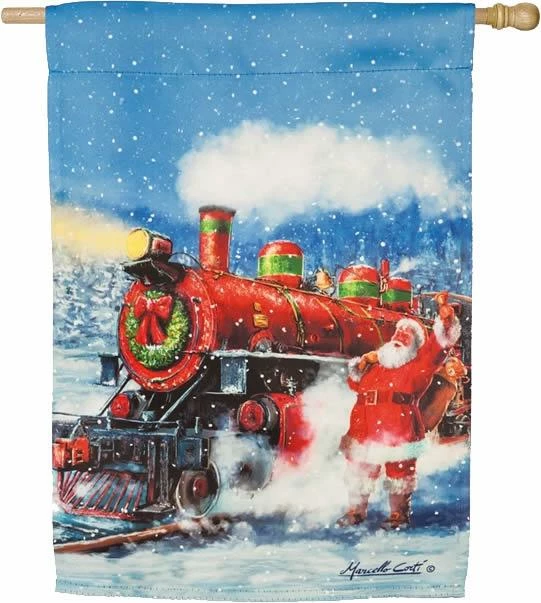 Santa Claus is coming to town! This suede decorative house flag shows Santa arriving in a decorated train. Smoke trails from the exhaust stack against the background of the blue, starry sky. This very colorful is perfect for decorating during the holidays.