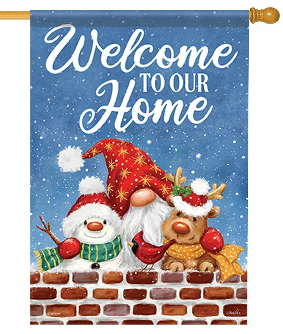 “Welcome to Our Home” Santa Gnome house flag is a group of fun-loving characters which also consist of a snowman, reindeer and a red cardinal. They are warm and inviting and would love to hang outside of your home to greet your family and friends for the holiday season. The wording reads correctly on both sides of the flag.