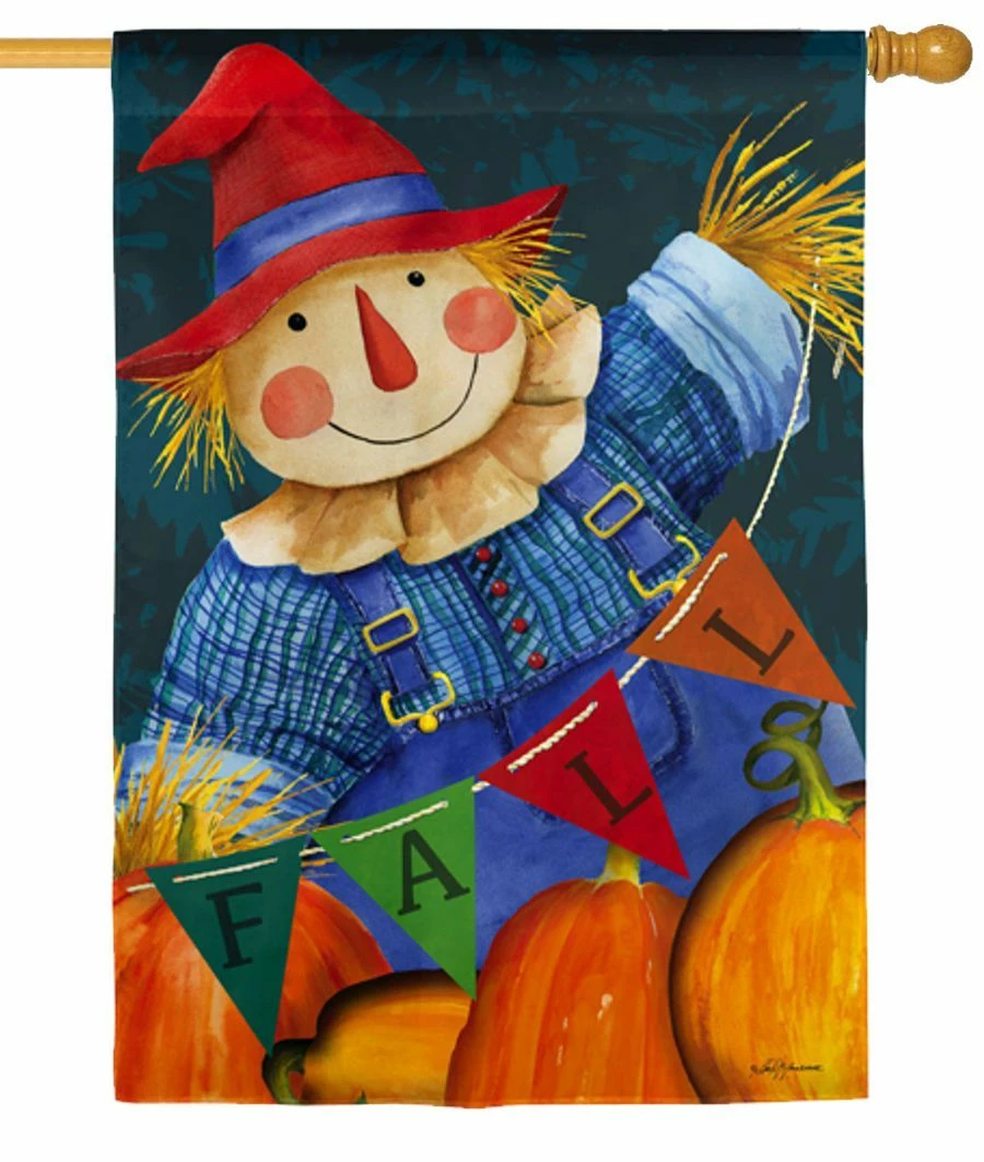 Welcome the fall season with this decorative house flag. The artwork shows a scarecrow holding a pennant banner that reads, “FALL”. The scarecrow is dressed in overalls and a bright red hat. The image is set against a dark blue background. The foreground is filled with bright orange pumpkins. The lettering reads correctly from both sides. This decorative house flag is a fun way to celebrate the joys of fall.