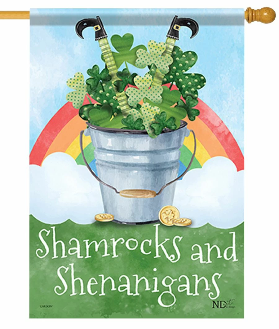 “Shamrocks and Shenanigans” is the theme that is depicted on this whimsical decorative house flag showing a mischievous little leprechaun who just went head first into a bucket with an explosion of polka-dotted shamrocks arranged as a bouquet of flowers rising back up out of the bucket. Soft clouds, a blue sky, and a rainbow appear in the background. The artwork is visible on both sides of the flag and the lettering reads right on both sides as well.
