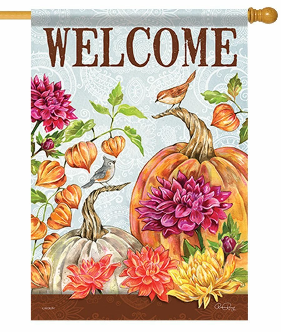 Embrace the beauty of the fall season with this decorative house flag. The image shows pumpkins and beautiful fall flowers. A sparrow and a bluebird perch on the pumpkins. The message reads across the top, “Welcome” in brown lettering against a pale background. This is a double-sided decorative house flag so the message and image read correctly from both sides. Welcome your guests with this fall with this stylish decorative house flag.