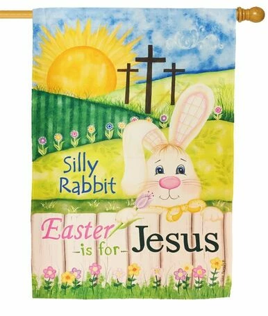This adorable, Easter themed, decorative house flag will serve as a lighthearted reminder of the true meaning of Resurrection Day with lovely, soft springtime color and tasteful artwork. The “Silly Rabbit Easter is for Jesus” lettering reads correctly from both sides. Hang this flag up at your Home or business to celebrate the resurrection of Jesus Christ.