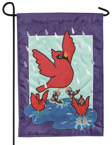 Celebrate April spring showers with this double applique garden flag depicting a cheerful trio of cardinals wearing rubber rain boots while singing and dancing in the rain. All of the details are appliqued and embroidered with beautiful stitching and applique work.
