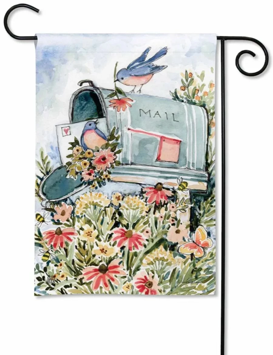 This bright floral-themed garden flag features an old, rustic mailbox with a pair of bluebirds collecting the flowers that are growing up all around the mailbox. The artwork is visible on both sides of the flag.