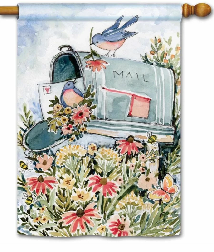 This bright floral-themed house flag features an old, rustic mailbox with a pair of bluebirds collecting the flowers that are growing up all around the mailbox. The artwork is visible on both sides of the flag.