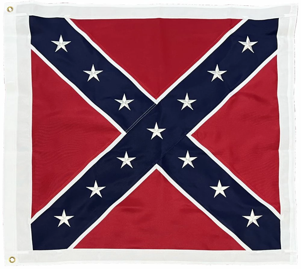This is a beautifully sewn 2 ply polyester Rebel 38×38 square artillery battle flag. The square battle flag was most commonly used by Confederate infantry, artillery and cavalry units because it was one of the few flags of the Confederacy that was professionally made in large quantities and was most readily available. The Richmond Depot, also known as the Richmond Clothing Bureau primarily made uniforms, socks and drawers for the Confederate military, but also produced quite a number of flags, the square battle flag being one of them. Officially, the 38″x38″ flag was intended for artillery units. Typically, the unit would take the flag and add their name i.e. 10th Texas, 20th Alabama, etc. and then add the “honors” (major battles in which they fought). Many other confederate military units were presented with flags “from home”. In other words, a local merchant or a group of women from the town or county the men in that unit were from, would design and make a flag for their men to carry into battle. Flag presentation ceremonies could be very elaborate social events. There were no two battle flags exactly alike, but this square configuration was definitely the most common and most recognizable.