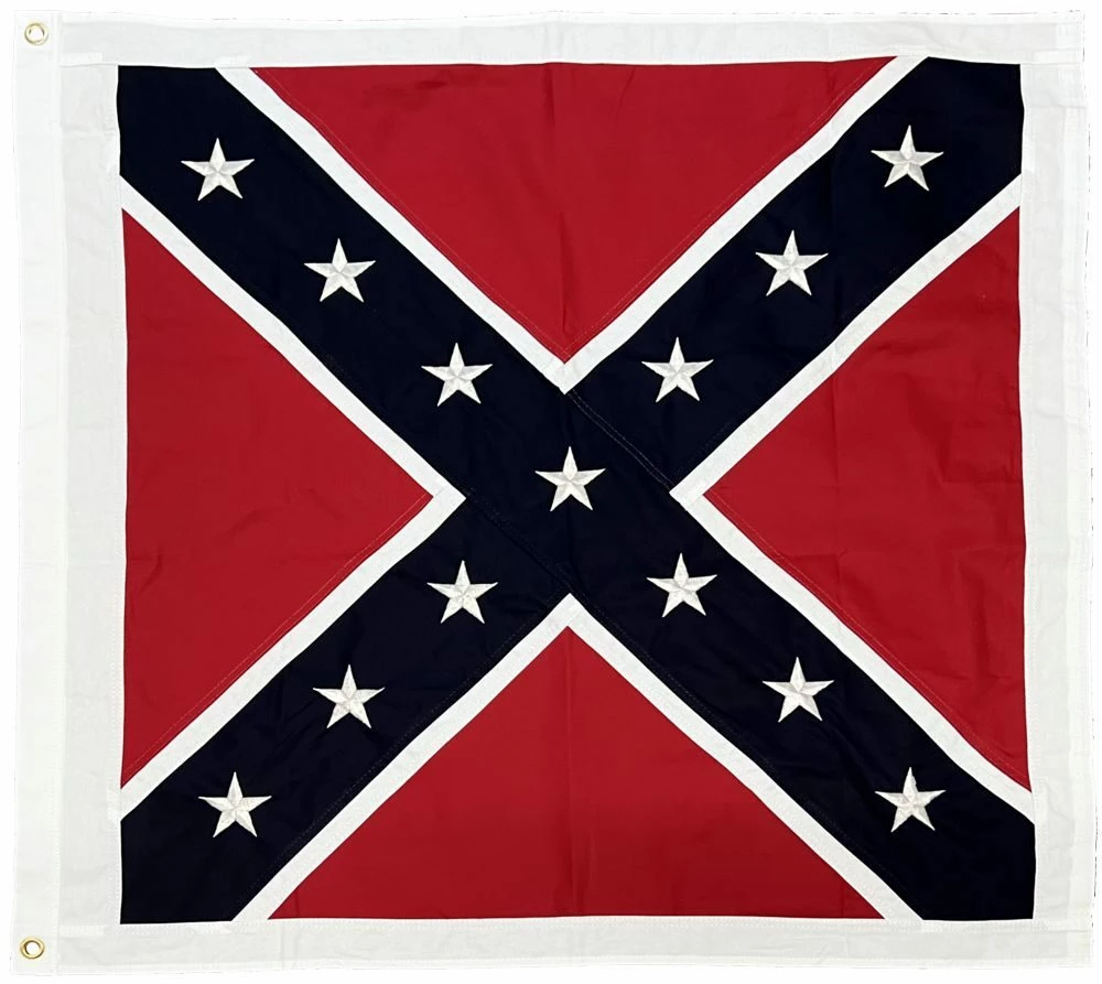 This is a beautifully sewn cotton Rebel 38×38 square battle flag. The square battle flag was most commonly used by Confederate infantry, artillery, and cavalry units because it was one of the few flags of the Confederacy that were professionally made in large quantities and were most readily available. The Richmond Depot, also known as the Richmond Clothing Bureau primarily made uniforms, socks, and drawers for the Confederate military, but also produced quite a number of flags, the square battle flag being one of them. Officially, the 38″x38″ flag was intended for Artillery units. Typically, the unit would take the flag and add their name i.e. 10th Texas, 20th Alabama, etc., and then add the “honors” (major battles in which they fought). Many other confederate military units were presented with flags “from home”. In other words, a local merchant or a group of women from the town or county the men in that unit were from, would design and make a flag for their men to carry into battle. Flag presentation ceremonies could be very elaborate social events. There were no two battle flags exactly alike, but this square configuration was definitely the most common and most recognizable.