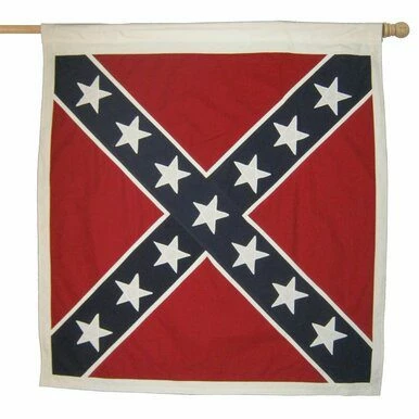 This is a beautifully sewn cotton. square Confederate battle flag. The square battle flag was most commonly used by Confederate infantry, artillery, and cavalry units because it was one of the few flags of the Confederacy that was professionally made in large quantities and was most readily available. The Virginia Clothing Depot primarily made uniforms, socks, and drawers for the Confederate military, but also produced quite a number of flags, the square battle flag being one of them. Officially, the 32″x32″ flag was intended for cavalry units, 38″x38″ for artillery and 52″x52″ for infantry, although many cavalry and artillery units preferred the larger size. Typically, the unit would take the flag and add their name i.e. 10th Texas, 20th Alabama, etc., and then add the “honors” (major battles in which they fought). Many other confederate military units were presented with flags “from home”. In other words, a local merchant or a group of women from the town or county the men in that unit were from, would design and make a flag for their men to carry into battle. Flag presentation ceremonies could be very elaborate social events. There were no two battle flags exactly alike, but this square configuration was definitely the most common and most recognizable.