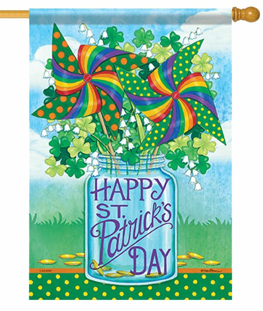 Show your Irish pride with this decorative house flag. The image shows a glass jar filled with multi-colored pinwheels and shamrocks. The background is green. The message reads on the body of the jar, “Happy St. Patrick’s Day” in purple script lettering. A green with white polka dots runs across the bottom. The lettering reads correctly from both sides. This St. Patrick’s Day decorate with this decorative house flag.