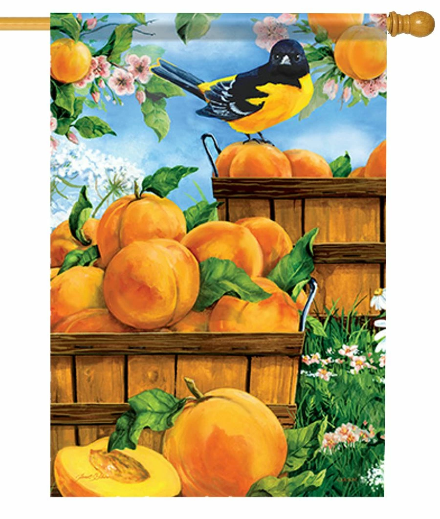 Celebrate this sweet season of life with this Summer Peaches House Flag. Two bushels are overflowing with fresh-picked peaches while a curious Oriole guards the peaceful scene. The green grass and blue sky are accented with seasonal flowers that bring the flag to life.