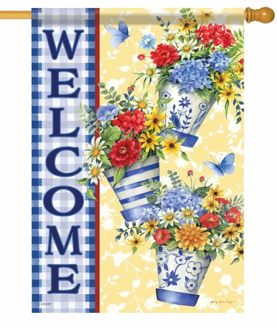 “Welcome” family and friends this Summer with this beautiful yellow house flag. On the left hand side is a blue and white gingham check border and on the right are three various blue and white planters full of various flowers in all different colors. This will look wonderful at your home or business. The wording reads correctly on both sides of the flag.