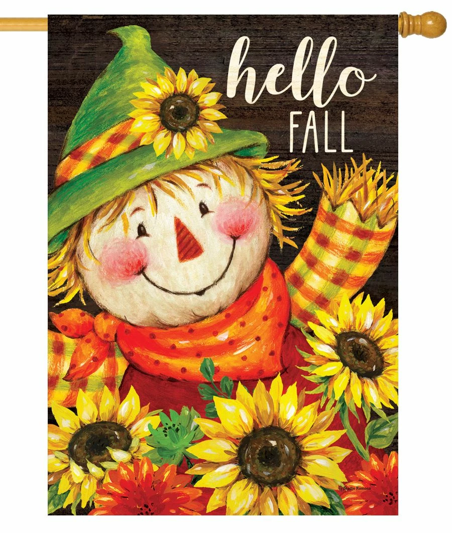 Bring the sunshine of fall into your décor with this decorative house flag. The artwork shows a smiling scarecrow waving hello. The scarecrow is dressed in a yellow and orange shirt with an orange kerchief. On his head, the scarecrow wears a straw hat with an orange and yellow plaid hatband that has a sunflower tucked in it. Bright yellow sunflowers and orange zinnias fill the foreground. The message reads, “Hello Fall” in white lettering against a black background. The lettering reads correctly from both sides. This decorative house flag is a fun, welcoming decoration for the fall season. Artwork by Studio Ramona.